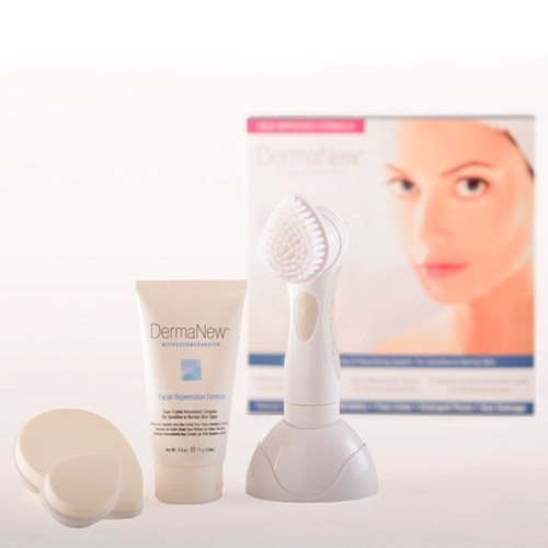 DermaNew Facial Rejuvenation System Gently resurface and smooth skin. The Dual Action Resurfacing Tool and Facial Rejuvenation Formula Microdermabrasion Crème work together to ensure a gentle, thorough resurfacing that will polish and refine with perfectly sized naturally mined Corundum Crystals and added antioxidants. Clinically proven to diminish wrinkles, fi ne lines and pore size while decreasing visible signs of sun damage while revealing healthy new skin. Kit contains 1 dual head resurfacing tool, 1 75g microdermabrasion crème, 1 body foam applicator, 1 tear drop face applicator, 1 brush, 1 tool stand, 2 AA batteries....